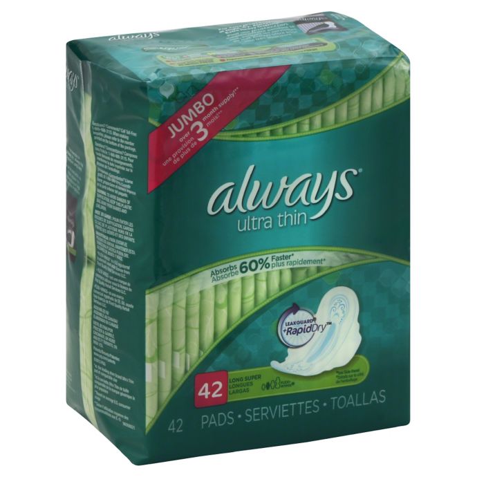 Absorbs 60% faster (vs. the leading store brand Ultra Thin pad of comparable size). LeakGuard + RapidDry. Over 3 month supply (based on average US consumer usage)! Clean. Dry. Fresh. During the day. Up to 8 hour absorbency for your busiest days. Flexi-wings help your pad stay put. Always Guarantee: Satisfaction guaranteed. Imported.
