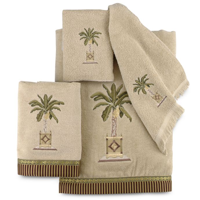Palm trees lend a calming element to this towel ensemble. Pattern is embroidered adding to the elegance of this all-cotton collection.