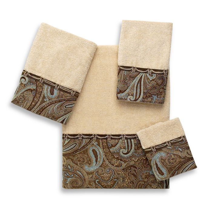 A classic paisley motif in browns and blues with coordinating braid looks great on these linen-colored towels. An elegant addition to any bathroom decor.