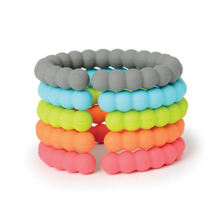 Keep your little one's toys attached to your stroller, high chair, or car seat with the Rainbow Silicone Links from Chewbeads. Soft and flexible, this clever design lets you link them together to allow baby to reach and grasp their toys with ease.