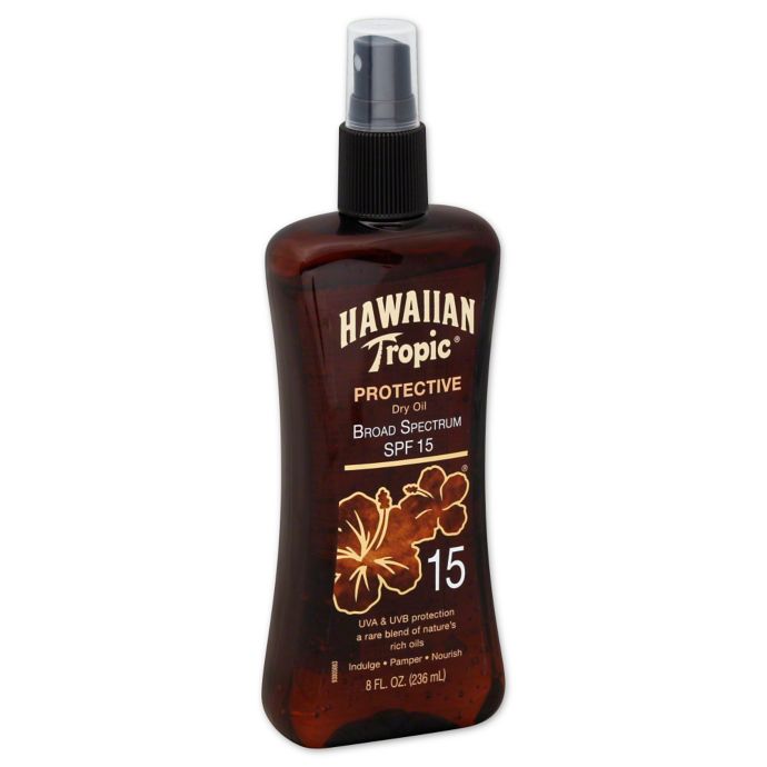 - Hawaiian Tropic Protective Dry Oil Sunscreen Pump Spray SPF 15 infused with island botanicals that soothe and pamper and antioxidants that nourish the skin