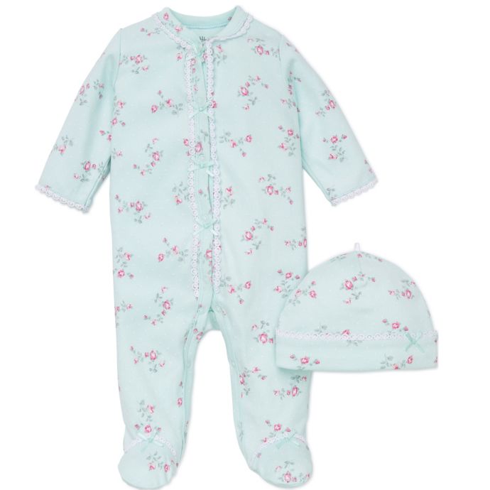 Soft and comfortable, the Floral Spray Footie Set from Little Me is a delightful aqua-colored outfit for your little one. Complete with a matching hat, this cotton footie keeps your baby cozy and comfy all day long.