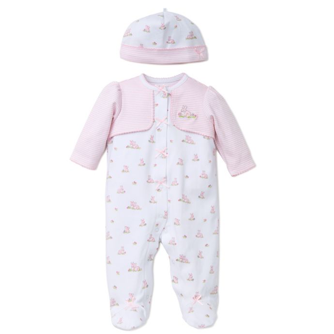 - Little Me's Baby Bunnies 2-Piece Footie with Faux Jacket and Hat Set will keep your baby bunny cozy in sweet orchid pink and white