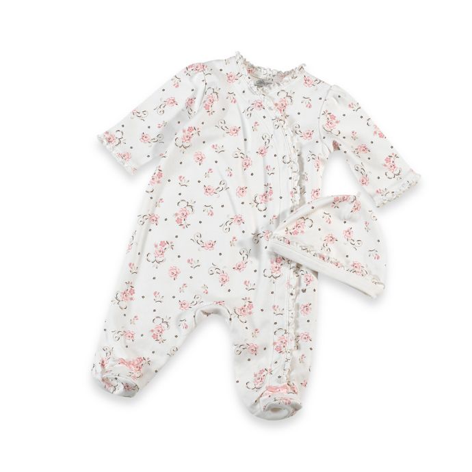 Dress your little one up in a cozy footie by Little Me. This Little Me vintage rose floral print footed coverall features a full-frontal button down snap closure for easy diaper changes and ruffles along its cuffs, front and complementary matching cap.