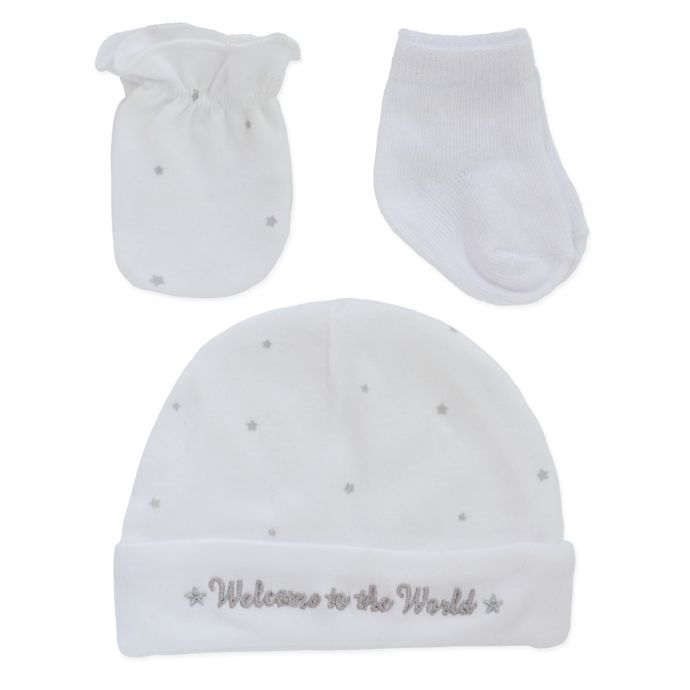 A new star is born, and Little Me greets the precious one with the Welcome to the World Layette Set. Made in softest cotton and delicately embroidered with words and stars, it would be a warmly welcomed shower gift.