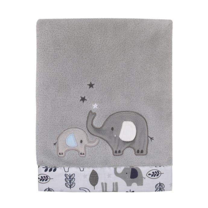Your little one will love snuggling up with the NoJo Love You to the Moon Baby Blanket. This soft blanket is made of plush fleece fabric in shades of grey with a Mama and Baby Elephant applique and an adorable print border edge.