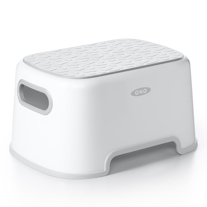 The OXO Tot Step Stool helps your little one reach places with a helpful 7" boost. It features a non-slip surface for keeping little feet in place and a sturdy base for staying firmly where you place it. Easy grip handles help with carrying.