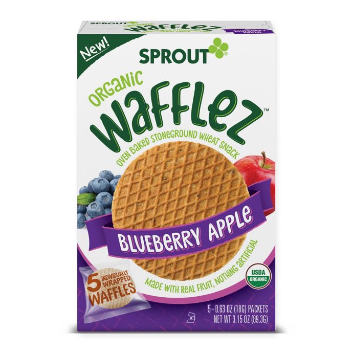 This 5-Pack of Sprout Waffles Blueberry Apple Organic Baked Wheat Snacks offers a tasty combination of organic ingredients with real fruit and veggies. These stoneground wheat snacks are oven-baked and are fun for toddlers to hold and eat.