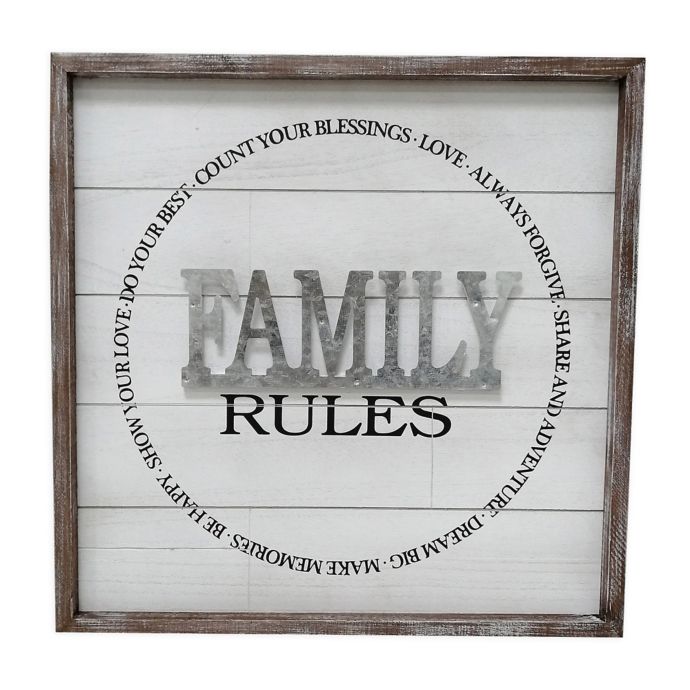 The "Family Rules" Wall Art from Sweet Bird & Co. is the perfect reminder of the basic household rules. Crafted with a background of shiplap and with the word "Family" wrought in metal. Comes ready to hang.