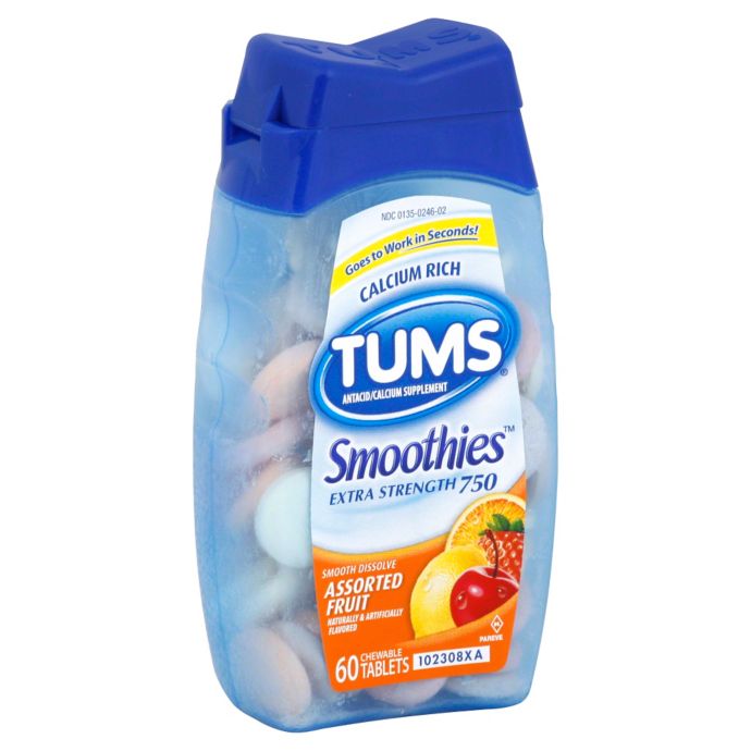 - TUMS Smoothies Extra-Strength Chewable Tablets in Assorted Fruit Flavors relieves heartburn and acid indigestion