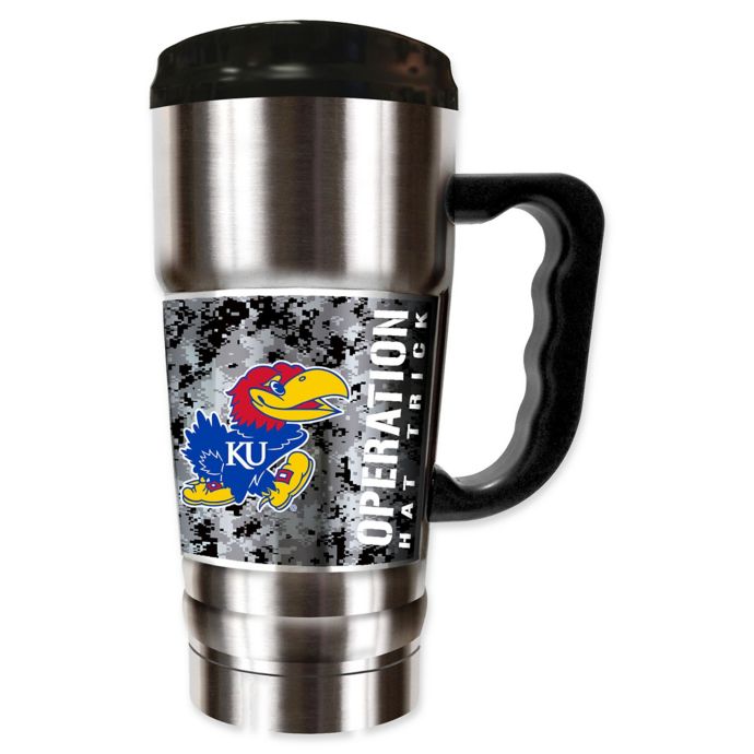 Support your college and the recovery of wounded service members and veterans with this Collegiate Operation Hat Trick Stainless Steel Travel Mug. Insulated mug features a colored commemorative university logo and wraparound OHT metallic graphics.