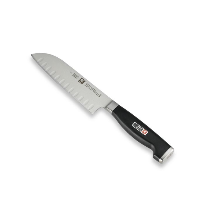 The Zwilling Four Star II 5" Santoku Knife features proper balance and greater strength is achieved with a full rat tail tang, while the super bolster provides weight, and insures safety and balance